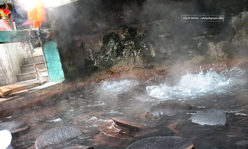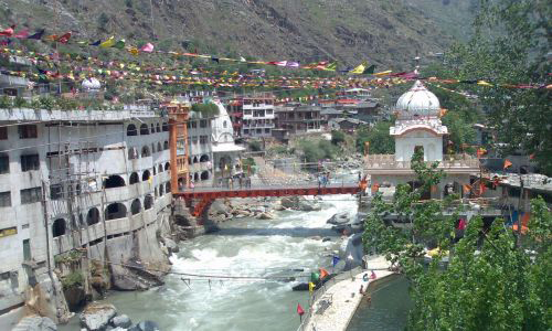 Manikaran is located in the Parvati Valley on river Parvati, northeast of Bhuntar in the Kullu District of Himachal Pradesh. It is at an altitude of 1760 m and is located about 35 km from Kullu. This small town attracts tourists visiting Manali and Kullu to its hot springs and pilgrim centres. An experimental geothermal energy plant has also been set up here. Manikaran is a pilgrimage centre for Hindus and Sikhs. The Hindus believe that Manu recreated human life in Manikaran after the flood, making it a sacred area. It has many temples and a gurudwara. There are temples of the Hindu deities Rama, Krishna, and Vishnu. The area is well known for its hot springs and its beautiful landscape. According to legend, when the Hindu God Shiva and his consort Parvati were walking in the valley, Parvati dropped one of her earrings. The jewel was seized by Shesha, the serpent deity, who then disappeared into the earth with it. Shesha only surrendered the jewel when Shiva performed the cosmic dance, the Tandava and shot the jewel up through the water. Apparently, jewels continued to be thrown up in the waters at Manikaran until the 1905 Kangra earthquake. Sikh belief: According to the Sikhs, during third Udasi, the founder of Sikhism Guru Nanak came to this place in 15 Asu 1574 Bikrami with his disciple Bhai Mardana. Mardana felt hungry and they had no food. Guru Nanak sent Mardana to collect food for the langar (the Community Kitchen). Many people donated atta (flour) to make Roti(bread). The one problem was that there was no fire to cook the food.Guru Nanak asked Mardana to lift a stone and he complied and a hot spring appeared. As directed by Guru Nanak, Mardana put the rolled chapatis in the spring to his despair the chapatis sank.Guru Nanak then told him to pray to God saying that if his chapatis float back then he would donate one chapati in His name. When he prayed all the chapatis started floating duly baked.Guru Nanak said that anyone who donates in the name of God, his drowned items float back. Hindu belief: The legend of Manikaran states that while roaming around, Lord Shiva and Goddess Parvati, once chanced upon a place that was surrounded by mountains and was lush green. Enamoured by the beauty of the place, they decided to spend some time there. It is believed that they actually spent eleven hundred years here. During their stay here, Goddess Parvati lost her mani (precious stones) in the waters of a stream. Upset over the loss, she asked Shiva to retrieve it. Lord Shiva commanded his attendant to find the mani for Parvati. However, when they failed, he was extremely angry. He opened his third eye, a tremendously inauspicious event which led to disturbances in the universe. An appeal was made before the serpent god, Sheshnag, to pacify Lord Shiva. Sheshnag hissed thereby giving rise to a flow of boiling water. The water spread over the entire area resulting in the emergence of precious stones of the type Goddess Parvati had lost. Lord Shiva and Goddess Parvati were happy at the outcome. The name Manikaran is derived from this legend. The water is still hot and is considered extremely auspicious. A pilgrimage to this place is thought of as complete. It is also believed that there is no need to pay a visit to Kashi after visiting this place. The water of the spring is also supposed to have curative powers. The water is so hot that rice can be cooked in it.