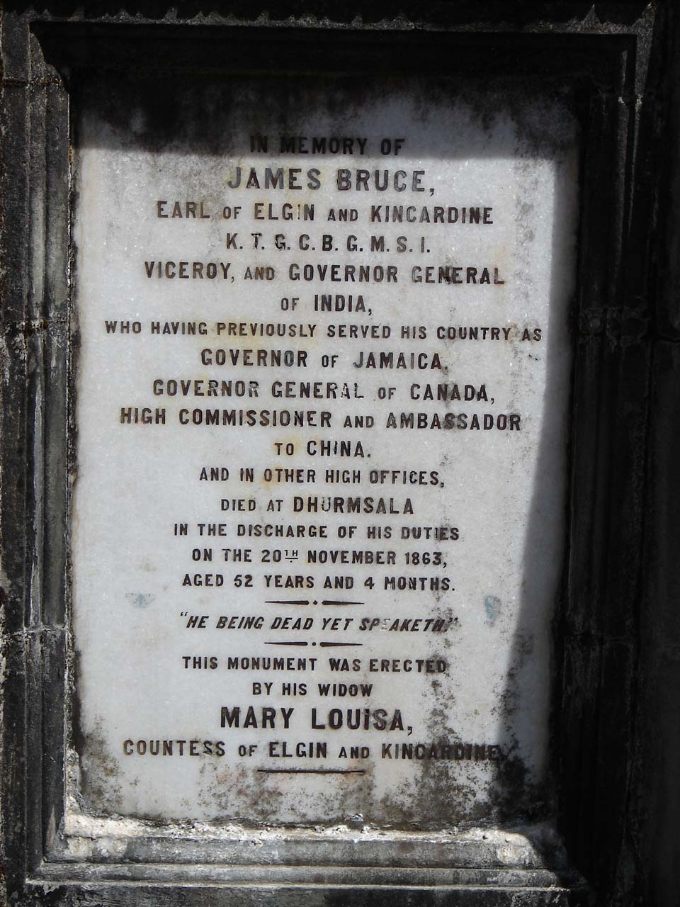 St. John in the Wilderness is a church of north India church dedicated to John the Baptist built in 1852, located near Dharamshala, India, on the way to McLeodGanj, at Forsyth Gunj. Set amidst deodar forest, and built in neo-Gothic architecture, the church is known for its Belgian stained-glass windows donated by Lady Elgin (Mary Louisa Lambton), wife of Lord Elgin. Though the church structure survived the 1905 Kangra earthquake, which killed close to 19,800 people, injured thousands in the Kangra area, and destroyed most buildings in Kangra, Mcleodganj and Dharamshala; its spire, Bell tower, was however destroyed. Later, a new bell, cast in 1915 by Mears and Stainbank, was brought from England and installed outside in the compound of the church. Its churchyard is the final resting place of Lord Elgin, who served as Governor General of the Province of Canada, who oversaw the Creation of Responsible Government in Canada, and later, while in China, ordered the complete destruction of the Old Summer Palace. He became Governor-General & Viceroy of India in 1861 during the British Raj, though he soon died at Dharamshala on 20 November 1863, and was buried there.