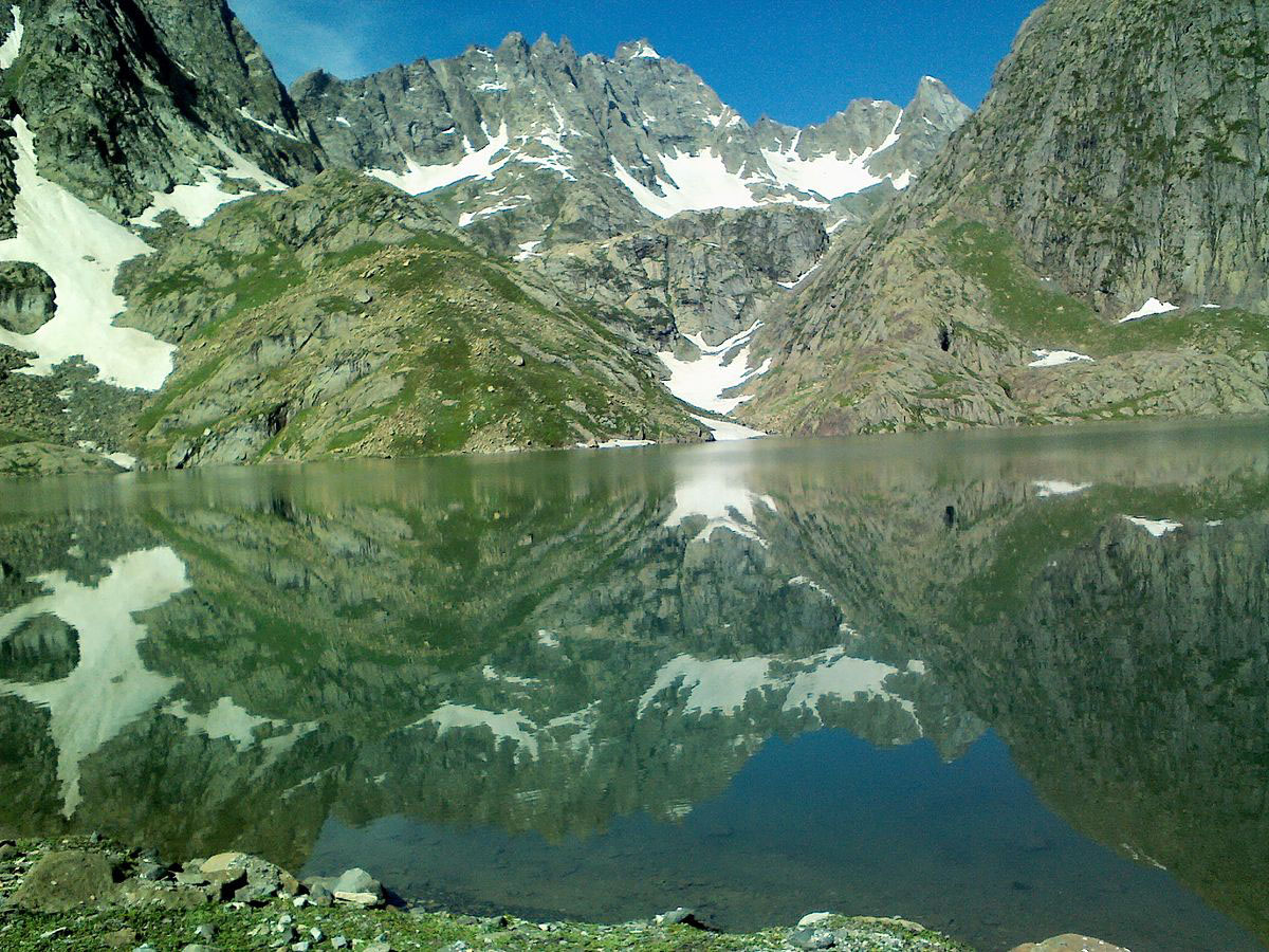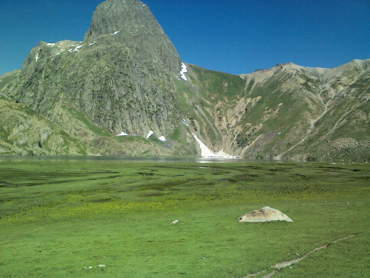 The Krishansar Lake is an alpine high altitude oligotrophic lake situated in the vicinity of Sonamarg, less than one kilometer from Vishansar Lake north westwards at an elevation of 3710 meters. It has a maximum length of 0.95 kilometers and maximum width of 0.6 kilometers. Krishansar in Kashmiri means the lake of Krishna. It is home to many types of fishes among of which is the brown trout. It freezes during winter, and is inaccessible during this season due to heavy snowfall. It is surrounded by green lush meadows and attracts local shepherds who graze their flocks of sheep and goat during summer. The Krishansar Lake is adjacent to Vishansar Lake, at its back are the mountains standing covered with snow in which lies the Gadsar Pass, a mountain pass which leads to the Gadsar Lake. The lake is a famous trekking site in the Kashmir Valley. It is mostly fed by melting of snow and glaciers. It drains out through a small stream which falls into the Vishansar Lake and gives rise to Neelum River. The Krishansar Lake is situated 115 km. northeast from Srinagar and 35 km from Shitkadi Sonamarg. It can be accessed from Srinagar or Srinagar Airport 80 km by road NH 1D up to village Shitkadi from which ponies can be hired to cover an alpine trek of 35 km to reach the Krishansar Lake, which takes a complete day of trekking passing Nichnai Pass of 4100 meters above sea level. The Gadsar Lake is some 9 kilometers in the north westwards. The best time to visit the lake is from the month of June to September.