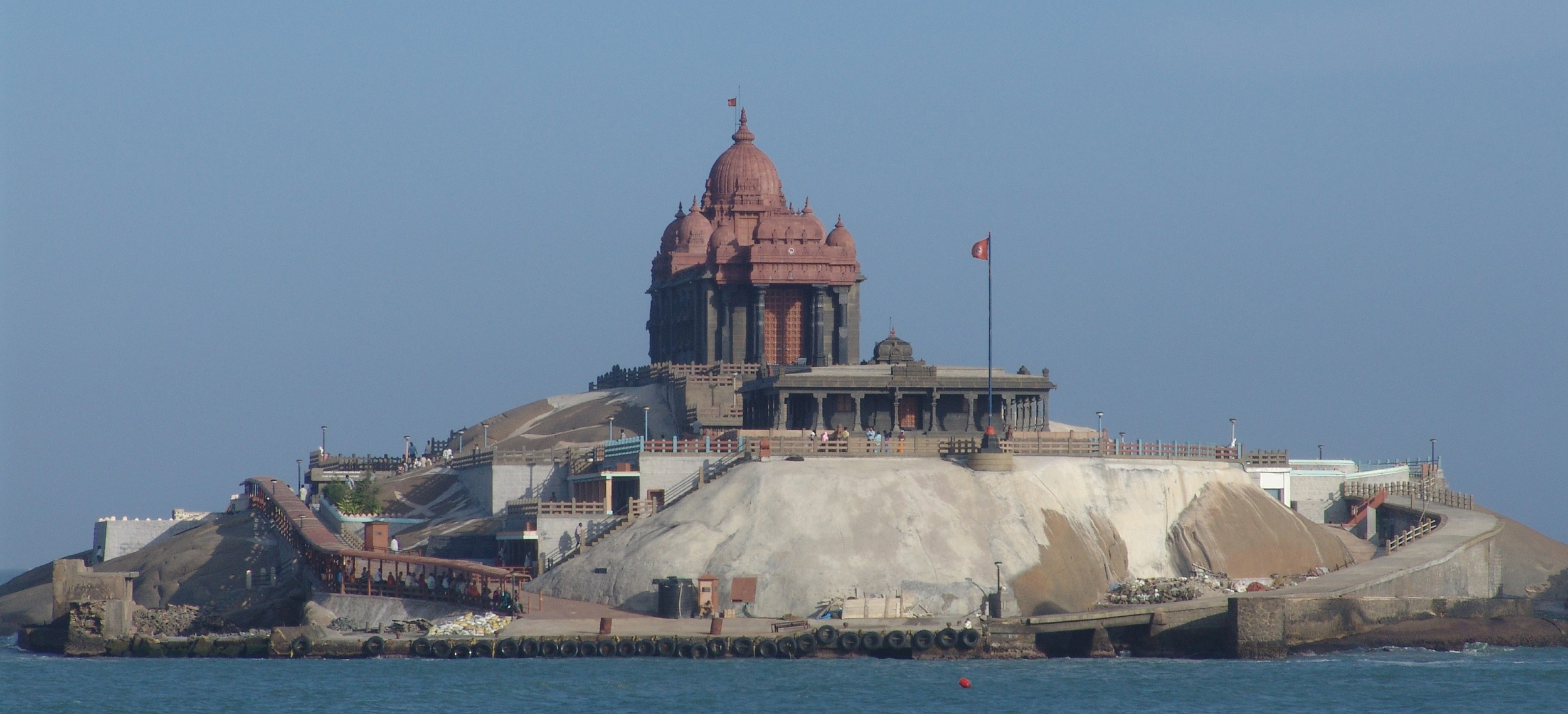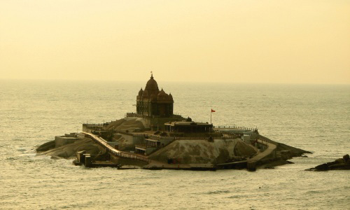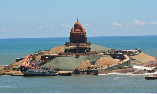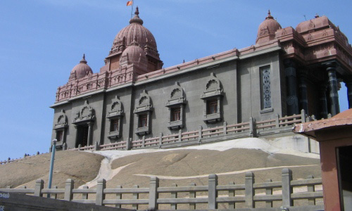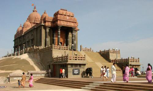 Vivekananda Rock Memorial is a popular tourist monument in Vavathurai, Kanyakumari, India. The memorial stands on one of two rocks located about 500 meters east off mainland of Vavathurai, India's southernmost tip. It was built in 1970 in honour of Swami Vivekananda who is said to have attained enlightenment on the rock. According to local legends, it was on this rock that Goddess Kumari performed austerity. A meditation hall (Dhyana Mandapam) is also attached to the memorial for visitors to meditate. The design of the mandapa incorporates different styles of temple architecture from all over India. It houses a statue of Vivekananda. The rocks are surrounded by the Laccadive Sea. The memorial consists of two main structures, the Vivekananda Mandapam and the Shripada Mandapam. In January 1962, on the occasion of Swami Vivekananda’s birth centenary, a group of people formed the Kanyakumari Committee whose objective was to put up a memorial on the rock and a pedestrian bridge leading to the rock. Almost simultaneously, the Ramakrishna Mission in Madras planned about this memorial. However, this news was not taken in good taste by a sizable population of the local Catholic fishermen. They put up a big Cross on the Rock, visible from the shore. This led to protests by the Hindu population who said the Rock was a place of worship for Hindus. A judicial probe ordered by the Madras (now Tamil Nadu) government stated in unequivocal terms that the rock was Vivekananda Rock, and that the Cross was a trespass. Amid all this acrimony, the Cross was removed secretly in the night. The situation turned volatile and the Rock was declared a prohibited area with armed guards patrolling it. The Government realised that the Rock was turning into an area of dispute with Hindus claiming it to be the Vivekananda Rock and Christians that it was St. Xavier’s Rock. It decreed that although the rock was Vivekananda Rock, there would be no memorial constructed on it. The then Chief Minister of Tamil Nadu, Shri M. Bhaktavatsalam, said that only a tablet declaring that the rock was associated with Swami Vivekananda could be put up, and nothing else. With government permission, the tablet was installed on the Rock on 17 January 1963.