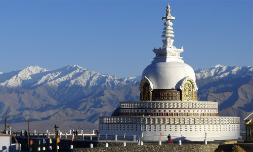 Shanti Stupa is a Buddhist white-domed stupa (chorten) on a hilltop in Chanspa, Leh district, Ladakh, in the north Indian state of Jammu and Kashmir. It was built in 1991 by Japanese Buddhist Bhikshu, Gyomyo Nakamura and part of the Peace Pagoda mission. The Shanti Stupa holds the relics of the Buddha at its base, enshrined by the 14th Dalai Lama. The stupa has become a tourist attraction not only due to its religious significance but also due to its location which provides panoramic views of the surrounding landscape. The Shanti Stupa was built by both Japanese Buddhists and Ladakh Buddhists. Original idea was stated by Nichidatsu Fujii (Fujii Guruji) in 1914. The mission of Nichidatsu Fujii was to build Peace Pagodas and temples over the world and try to resurrect Buddhism back in India. Construction of the Shanti Stupa began in April 1983 under the supervision of Bhikshu Gyomyo Nakamura and Kushok Bakula, a lama of Ladakh from New Delhi, member of the Minority commission of Govt of India, former statesman and former international diplomat of the Republic of India. The project was built with the help of Ladakhi Buddhists, who offered voluntary labour, and Japanese Buddhists, who consider India as the "sacred" birthplace of the Buddha. The then List of Prime Ministers of India, Indira Gandhi, sanctioned the construction of a vehicular road to the stupa in 1984. The state government also provided some financial assistance for the construction of the Shanti Stupa.[citation needed] The 14th and current Dalai Lama, Tenzin Gyatso inaugurated the Shanti Stupa in August 1991. The Shanti Stupa features the photograph of the current Dalai Lama with the relics of the Buddha at its base. The stupa is built as a two-level structure. The first level features the central relief of Dharmacakra with deer on each side. A central golden Buddha image sits on a platform depicting the "turning wheel of Dharma" (Dharmacakra). The second level has reliefs depicting the "birth" of Buddha, the death of Buddha (mahanirvana) and Buddha "defeating the devils" while meditating. Both levels feature a series of smaller meditating Buddha reliefs. The Shanti Stupa was built to promote world peace and prosperity and to commemorate 2500 years of Buddhism. It is considered a symbol of the ties between the people of Japan and Ladakh. Since its inauguration, Shanti Stupa has become a popular tourist attraction. According to The Hindu it is the "most famous tourist attraction" around Leh, though its architectural style is different from the Ladakhi style. The Shanti Stupa overlooks the city of Leh, providing panoramic views of the city, the village of Changspa, Namgyal Tsemo in the distance and the surrounding mountains. Sunrise and sunset are considered to provide the best views from Shanti Stupa. The stupa is illuminated with lights at night. The stupa is open for tourists between 5:00 a.m. and 9:00 p.m.