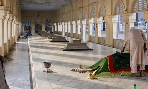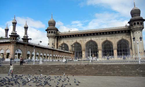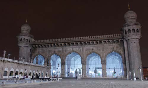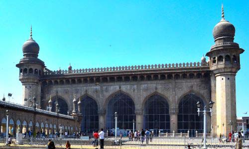 Mecca Masjid also Makkah Masjid, is one of the oldest mosques in Hyderabad, Telangana in India, and it is one of the largest masajids in India. Makkah Masjid is a listed heritage building in the old city of Hyderabad, close to the historic landmarks of Chowmahalla Palace, Laad Bazaar, and Charminar. Muhammad Quli Qutb Shah, the fifth ruler of the Qutb Shahi dynasty, commissioned bricks to be made from the soil brought from Mecca, the holiest site of Islam, and used them in the construction of the central arch of the mosque, thus giving the mosque its name. It formed the centerpiece around which the city was planned by Muhammad Quli Qutub Shah. Makkah Masjid was built during the reign of Muhammad Quli Qutb Shah, the 5th Qutb Shahi Sultan of Golconda (now Hyderabad). The three arched facades have been carved from a single piece of granite, which took five years to quarry. More than 8,000 workers were employed to build the mosque. Muhammad Quli Qutb Shah personally laid the foundation stone. The construction was later completed by Mughal Emperor Aurangzeb after conquering Hyderabad. "It is about 50 years since they began to build a splendid pagoda in the town which will be the grandest in all India when it is completed. The size of the stone is the subject of special accomplishment, and that of a niche, which is its place for prayer, is an entire rock of such enormous size that they spent five years in quarrying it, and 500 to 600 men were employed continually on its work. It required still more time to roll it up on to conveyance by which they brought it to the pagoda; and they took 1400 oxen to draw it."