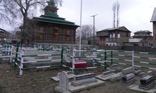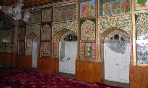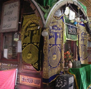Ziyarat Naqshband Sahab (also known as Mausoleum Hazrat Khawaja Naqshbandh Sahib) is a Muslim shrine, or ziyarat, in Jammu and Kashmir, in India. This shrine is named after the well known Bukhara mystic, Khawaja Syed Bha-u-Deen Naqsaband, the founder of a Sufi order. It is one of the important shrines, located amidst a large garden. The area in which this shrine is built was called Sikander-pore because it was built by Sultan Sikandar (1389-1413)(Sikandar Butshikan). During the Chak times Sulatn Hussain Chak (1563-1570) built a garden in this area. According to Tareekh-e-Hassan Zain-ul-Abidin (Budshah) had built a Shrine for Syed Mohammad Owaisi in Isham, Kashmir. Owaisi died in 1484 and that shrine was more or less abandoned. In 1633 Khawja Khawand Mahmood obtained a fatwa to demolish the old shrine and used the same material to build the present Naqahband shrine, in what at that time would have been Hussian Chaks old garden. Because of Khawja Khawand Mahmood’s name the neighborhood is still called Khwaja Bazzar. After Khawja Khawand Mahmood’s death in 1640 in Lahore, his son Khawaja Moin-Ud-Din Naqashbandi came to Kashmir to look after the shrine. He died in 1674 and is buried at the shrine. When the holy relic of prophet Mohammad’s hair was brought to Kashmir in 1699, it was first kept at this shrine. There was not enough space to accommodate the crowds that came to see the holy relic. So the Mughal Governor at that time donated what was then called Sadiq Khan Bagh. This place became the present Hazratbal Shrine that has since then housed the holy relic. In 1886 Nawab of Dhaka Sir Khwaja Ahsanullah, whose ancestors were from Kashmir, sent money that was used for major renovation of the present building of the shrine. It is in Nowhatta on the road between the Dastagir Sahib and the Jama Masjid. Part of its compound was converted into Martyrs’ Graveyard in 1931. The market in the vicinity is named after the saints shrine as Khwaja Bazar The mystic never visited Kashmir but his followers made a Khankah in his name. In this Khankah, the corpse of Mohi-u-din, one of his descendants lies buried in the mausoleum. This mainly wooden shrine has some fine panels done in the pinjra-kari style. The urs of Naqshaband Sahib is observed on the 3rd day of the Hijri month of Rabi-ul-Awwal. Recently a library has also been constructed in the compound of the shrine. This 17th-century shrine was built in the style of nearby Himachal Pradesh, consisting of alternating layers of wood and brick, to mitigate the impact of earthquakes.