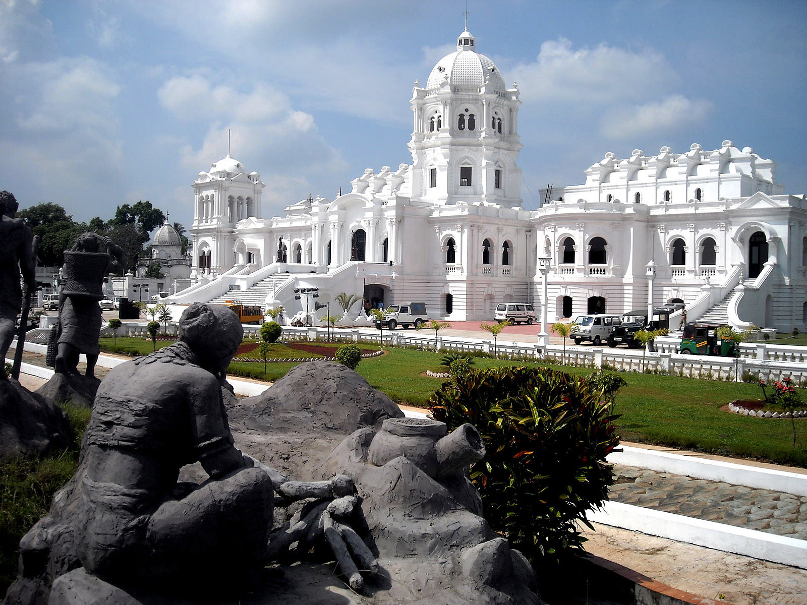 The Ujjayanta Palace is a museum and former royal palace of Tripura (princely state) situated in Agartala, the capital of the Indian state of Tripura. The palace was constructed between 1899 and 1901 by the Tripura king, Maharaja Radha Kishore Manikya, and stands on the banks of a small lake surrounded by Mughal gardens. It was the home of the ruling Manikya dynasty until the Tripura`s accession to India in October 1949. The palace was purchased from the royal family by the Tripura government in 1972-73 for Rs. 2.5 million, and was used to house the state legislative assembly until July 2011. Ujjayanta Palace is now a state museum and it showcases the lifestyle, arts, culture, tradition and utility crafts of communities residing in northeast India. The name 'Ujjayanta Palace' was given by Rabindranath Tagore, the first Asian Nobel Prize winner. Tripura claims to be one of the oldest princely states of ancient India. The royal line of Tripura began during the reign of Maharaja Maha Manikya, who was crowned in 1400 AD, and was the first ruler under the royal title of Manikya. Ujjayanta Palace was built in 1862, 10 km (6 mi) away from Agartala, by King Ishan Chandra Manikya (1849-1862). It was devastated by the Assam earthquake of 12 June 1897. The palace was rebuilt in the heart of Agartala city by Maharaja Radha Kishore Manikya in 1899–1901, at a cost of 10 lakh (1 million) rupees. It was built by Martin Burn Company, and served as the model of the Maharajah's palace in Tintin and the Cigars of the Pharaoh. Upon the merger of the Kingdom of Tripura with India in 1949, royal properties were nationalised. The main building along with the area around the palace was purchased from the royal family by the Tripura government in 1972-73. It housed the Tripura Legislative Assembly until July 2011 when the assembly moved to a new location 6 km (3.7 mi) north of Agartala. As state museum: In 2013, the Ujjayanta Palace became home to the Tripura Government Museum, the biggest museum in the region, which was established in 1970. The museum contains 22 galleries and showcases northeast India’s art, culture, history, tradition and ethnic diversity. The items on display include sculptures, terracotta figurines, coins, copper and stone inscriptions, bronze images, textiles, oil paintings, sketches and drawings, tribal ornaments, and musical instruments. In addition, the state archive has been moved to Ujjayanta Palace. The museum was provided with seismic retrofitting to prevent it from possible earthquake damage, at a cost of Rs. 100 million, and the museum was inaugurated by the Vice President of India Mohammad Hamid Ansari on 25 September 2013. Early in the museum's history, controversy erupted over the state government's proposed move to change the name of Ujjayanta Palace to Tripura State Museum. The Indigenous Nationalist Party of Twipra (INPT) has written to Vice President, Hamid Ansari, protesting that the name of the museum should reflect the history and heritage of the region. Pradyut Bikram Kishore Debbarma, the titular king of Tripura said, “The palace is a historical spot. It doesn’t belong to the members of erstwhile royal family alone, neither does it solely belongs to the government. It belongs to Tripura and somebody in the government can’t suddenly impose a decision to change its name". After a candle-light rally attended by about 8000 people, the government decided to keep the original name of Ujjayanta Palace and to build a statue of Maharaj Radha Kishore Manikya on the museum premises. The Ujjayanta Palace compound covers an area of approximately 1 km2 (250 acres) and includes public rooms such as the throne room, durbar hall, library and reception hall. The buildings and grounds cover 800 acres (3.2 km2) in the heart of Agartala. The neoclassical palace was designed by Sir Alexander Martin of Martin Burn Company. The Chinese Room is particularly notable, the ceiling of which was crafted by artisans brought from China. The two-storied palace has three large domes, the largest of which is 86 ft (26 m) high, and which rests atop a four-storied central tower. The architecture shows a mix of influences: Mughal, Roman and British The palace has tiled floors and carved front doors. A newer attraction is the musical fountain installed in front of the main entrance. The grounds are laid out as formal Mughal gardens adorned with fountains. There are two large artificial ponds on either side of the garden which is decorated with pools and fountains. Several Hindu temples occupy plots adjacent to Ujjayanta Palace, dedicated to Lakshmi Narayan, Uma-Maheshwari, Kali and Jagannath.