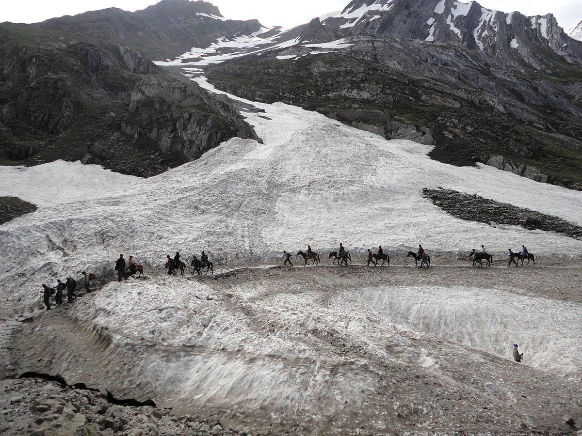 Amarnath cave is a Hindu shrine located in Jammu and Kashmir, India. The cave is situated at an altitude of 3,888 m (12,756 ft), about 141 km (88 mi) from Srinagar, the capital of Jammu and Kashmir and reached through Pahalgam town. The shrine forms an important part of Hinduism, and is considered to be one of the holiest shrines in Hinduism. The cave is surrounded by snowy mountains. The cave itself is covered with snow most of the year except for a short period of time in summer when it is open for pilgrims. Thousands of Hindu devotees make an annual pilgrimage to the Amarnath cave on challenging mountainous terrain to see an ice stalagmite formed inside the cave. Inside the 40 m (130 ft) high Amarnath cave, the stalagmite is formed due to freezing of water drops that fall from the roof of the cave on to the floor and grows up vertically from the cave floor. It is considered to be a Shiva Linga by Hindus. It is mentioned in the ancient Hindu texts of Mahabharata and Puranas that Lingam is representation of Lord Shiva. The Cave waxes during May to August, as snow melts in the Himalayas above the cave and the resultant water seeps into the rocks that form the cave and gradually wanes thereafter. As per the religious beliefs, it has been claimed that the lingam grows and shrinks with the phases of the moon reaching its height during the summer festival, although there is no scientific evidence for this belief. According to a Hindu legend, this is the cave where Shiva explained the secret of life and eternity to his divine consort, Parvati. The book Rajatarangini (Book VII v.183) refers to Amareshwara or Amarnath. It is believed that Queen Suryamathi in the 11th century AD gifted trishuls, banalingas and other sacred emblems to this temple. Rajavalipataka, begun by Prjayabhatta has detailed references to the pilgrimage to Amarnath Cave. Other than this, there are further references to this pilgrimage in many other ancient texts. It is believed that after the Middle Ages, this cave was forgotten by people before it was discovered by a shepherd in the 15th century once again. Another story relates to Bhrigu Muni. Long time ago it is believed that The Vale of Kashmir was submerged under water and Kashyapa Muni drained it through a series of rivers and rivulets. Therefore, when the waters drained, Bhrigu Muni was the first to have Darshan of Lord Amarnath. Thereafter, when people heard of the Lingam, it became an abode of Lord Bholenath for all believers and a pilgrimage which is done by lakhs of people each year. As we well know Francois Bernier, a French physician accompanied Emperor Aurangzeb during his visit to Kashmir in 1663. In his book “Travels in Mughal Empire” he writes while giving an account the places he visited in Kashmir that he was “pursuing journey to a grotto full of wonderful congelations, two days journey from Sangsafed” when he “received intelligence that my Nawab felt very impatient and uneasy on account of my long absence”. The “grotto” he refers to is obviously the Amarnath cave as the editor of the second edition of the English translation of the book, Vincient A. Smith makes clear in his introduction. He writes: “The grotto full of wonderful congelations is the Amarnath cave, where blocks of ice, stalagmites formed by dripping water from the roof are worshipped by many Hindus who resort here as images of Shiva...” The temple is a popular yatra destination for Hindus. In 2011 it received about 634,000 persons, the highest recorded number for the site. The number was 622,000 in 2012 and 350,000 in 2013. Pilgrims visit the holy site during the 45-day season around the festival of Shravani Mela in July–August, coinciding with the Hindu holy month of Shraavana. The beginning of the annual pilgrimage, called Amarnath Yatra is marked by 'pratham pujan' to invoke the blessings of Shri Amarnathji. In olden days the route was via Rawalpindi (Pakistan) but now a direct train is there connecting rest of India to Jammu, the winter capital of the State. The best part of journey is between Guru Purnima and Shravan Purnima. The Government of Jammu and Kashmir makes all arrangements for the comfort of the pilgrims for undertaking the ritualistic journey for visiting the shrine on Shravan Purnama. But the highly unpredictable weather of the mountains should be more obliging before Guru Purnima as rains would not start. There is a bus service from Jammu to Pahalgam (7,500 ft.). At Pahalgam the pilgrims arrange for coolies or ponies to carry gear of food and clothes etc. Everybody remains busy making arrangements for the Yatra. The golden glow of, the sun falls on the turbulent river at Pahalgam. Pahalgam in Kashmiri means the land of shepherds. Devotees travel on foot, either from Srinagar or from Pahalgam. The latter journey takes approximately 5 days. The State Road Transport Corporation and Private Transport Operators provide the regular services from Jammu to Pahalgam and Baltal. Also privately hired taxis are available from Jammu & Kashmir. The shorter northern route is just about 16 km long, but has a very steep gradient and is quite difficult to climb. It starts from Baltal and passes through Domial, Barari, and Sangam to reach the cave. The northern route is along the Amarnath valley and all along the route one can see the river Amaravathy (It is more like a tributary of Chenab) which originates from Amarnath Glacier. It is believed that Lord Shiva left Nandi, The Bull, at Pahalgam (Bail Gaon). At Chandanwari, he released the Moon from his hair (Jataon). On the banks of Lake Sheshnag, he released his snakes. At Mahagunas Parvat (Mahaganesh Mountain), he left his son Lord Ganesha. At Panjtarni, Lord Shiva left behind the five elements - Earth, Water, Air, Fire and Sky. As a symbol of sacrificing the earthly world, Lord Shiva performed the Tandava Dance. Then, finally, Lord Shiva entered the Holy Amarnath Cave along with Parvathi. En route the cave, various n