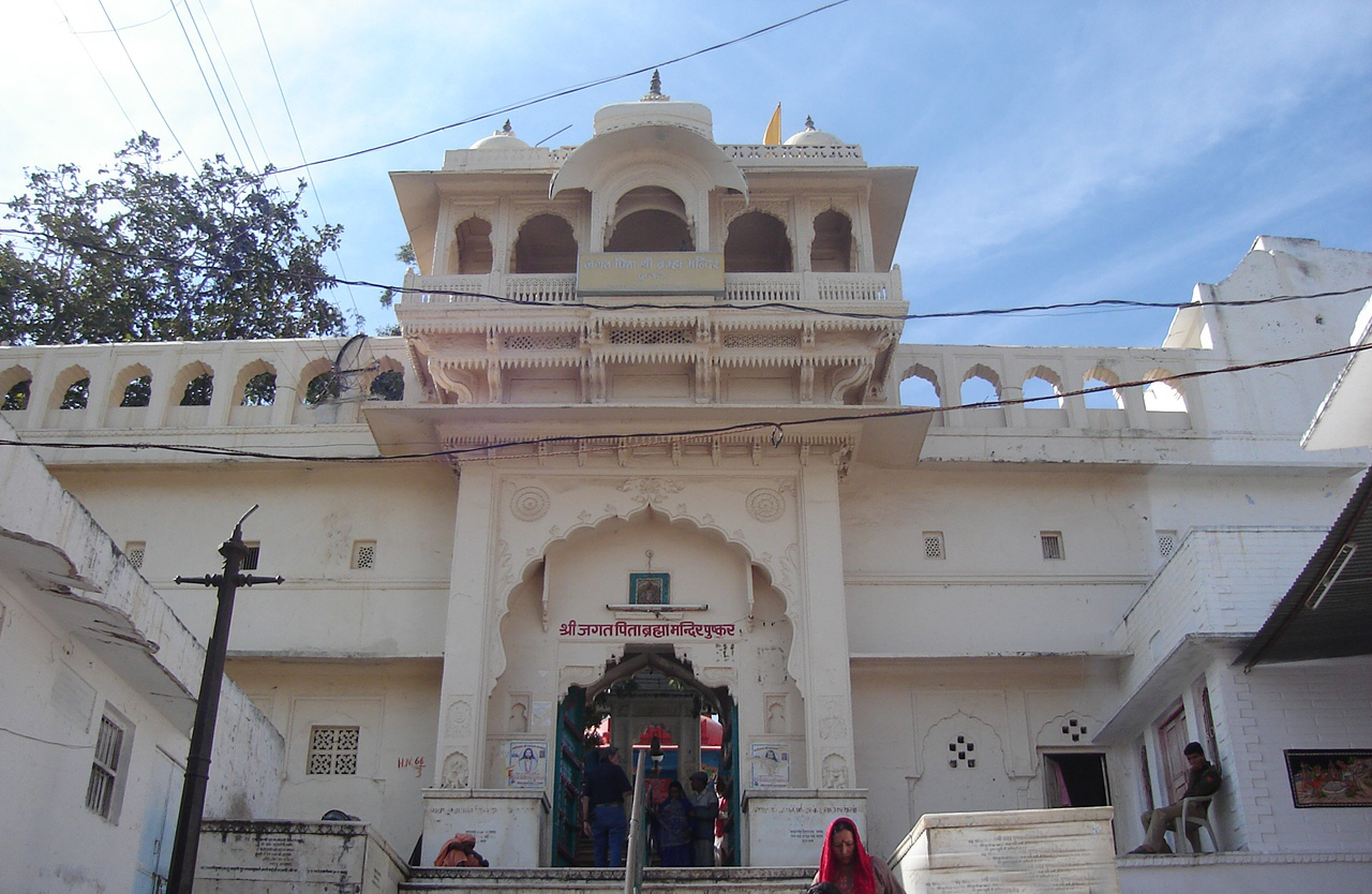 Jagatpita Brahma Mandir is a Hindu temple situated at Pushkar in the Indian state of Rajasthan, close to the sacred Pushkar Lake to which its legend has an indelible link. The temple is one of very few existing temples dedicated to the Hindu creator-god Brahma in India and remains the most prominent among them. The temple structure dates to the 14th century, partly rebuilt later. The temple is made of marble and stone slabs. It has a distinct red pinnacle (shikhara) and a hamsa bird motif. The temple sanctum sanctorum holds the image of four-headed Brahma and his consort Gayatri(goddess of milk). The temple is governed by the Sanyasi (ascetic) sect priesthood. On Kartik Poornima, a festival dedicated to Brahma is held when large numbers of pilgrims visit the temple, after bathing in the sacred lake. Pushkar is said to have over 500 temples (80 are large and the rest are small); of these many are old ones that were destroyed or desecrated by Muslim depredations during Mughal emperor Aurangzeb's rule (1658–1707) but were rebuilt subsequently; of these the most important is the Brahma temple. The structure dates to the 14th century. The temple is described to have been built by sage Vishwamitra after Brahma's yagna (ritual). It is also believed that Brahma himself chose the location for his temple. The 8th century Hindu philosopher Adi Shankara renovated this temple, while the current medieval structure dates to Maharaja Jawat Raj of Ratlam, who made additions and repairs, though the original temple design is retained. Pushkar is often described in the scriptures as the only Brahma temple in the world, owing to the curse of Savitri(Saraswati), and as the "King of the sacred places of the Hindus". Although now the Pushkar temple does not remain the only Brahma temple, it is still one of very few existing temples dedicated to Brahma in India and the most prominent one dedicated to Brahma. International Business Times has identified Pushkar Lake and the Brahma temple as one of the ten most religious places in the world and one of the five sacred pilgrimage places for the Hindus, in India. According to the Hindu scripture Padma Purana, Brahma saw the demon Vajranabha (Vajranash in another version) trying to kill his children and harassing people. He immediately slew the demon with his weapon, the lotus-flower. In this process, the lotus petals fell on the ground at three places, creating 3 lakes: the Pushkar Lake or Jyeshta Pushkar (greatest or first Pushkar), the Madya Pushkar (middle Pushkar) Lake, and Kanishta Pushkar (lowest or youngest Pushkar) lake. When Brahma came down to the earth, he named the place where the flower ("pushpa") fell from Brahma's hand ("kar") as "Pushkar". Brahma then decided to perform a yajna (fire-sacrifice) at the main Pushkar Lake. In order to perform his yajna peacefully without being attacked by the demons, he created the hills around the Pushkar – Ratnagiri in the south, Nilgiri in the north, Sanchoora in the west and Suryagiri in the east and positioned gods there to protect the yajna performance. However, while performing the yajna, his wife Savitri (Saraswati)could not be present at the designated time to perform the essential part of the yajna as she was waiting for her companion goddesses Lakshmi, Parvati and Indrani. Annoyed, Brahma requested god Indra(the king of heaven) to find a suitable girl for him to wed to complete the yajna. Indra could find only a Gujar's daughter (a milkmaid) who was sanctified by passing her through the body of a cow. Gods Vishnu, Shiva and the priests certified her purity as she had passed through a cow, it was her second birth and she was named Gayatri(goddess of milk). Brahma then married Gayatri and completed the yajna with his new consort sitting beside him, holding the pot of amrita (elixir of life) on her head and giving ahuti (offering to the sacrificial fire). But when Savitri finally arrived at the venue she found Gayatri sitting next to Brahma which was her rightful place. Agitated, she cursed Brahma that he would be never worshipped, but then reduced the curse permitting his worship in Pushkar. Savitri also cursed Indra to be easily defeated in battles, Vishnu to suffer the separation from his wife as a human, the Agni(fire-god ) who was offered the yajna to be all-devouring and the priests officiating the yajna to be poor. Endowed by the powers of yajna, Gayatri diluted Savitri's curse, blessing Pushkar to be the king of pilgrimages, Indra would always retain his heaven, Vishnu would be born as the human Rama and finally unite with his consort and the priests would become scholars and be venerated. Thus, the Pushkar temple is regarded the only temple dedicated to Brahma. Savitri, thereafter, moved into the Ratnagiri hill and became a part of it by emerging as a spring known as the Savitri Jharna (stream); a temple in her honour exists here. The temple, which is set on high plinth, is approached through a number of marble steps leading to an entrance gate archway, decorated with pillared canopies. The entry from the gate leads to a pillared outdoor hall (Mandapa) and then the sanctum sanctorum (Garbhagriha). The temple is built with stone slabs and blocks, joined together with molten lead. The red shikara (spire) of the temple and symbol of a hamsa (a swan or goose) - the mount of Brahma – are distinct features of the temple. The shikara is about 70 feet (21 m) in height. The hamsa motif decorates the main entry gate. Marble floor (in black and white checks) and walls inside the temple have been inlaid with hundreds of silver coins by devotees (with their names inscribed), as mark of offering to Brahma. There is a silver turtle in the mandap, that is displayed on the floor of the temple facing the Garbhagriha, which is also built in marble. The marble flooring has been replaced from time-to-time. Brahma's central icon (murti) made of marble was deified in the garbhagriha 718 AD by Adi Shankara. The icon depict
