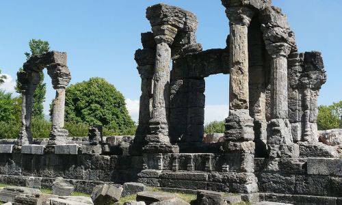 The Martand Sun Temple was a Kashmiri Hindu temple dedicated to Surya (the chief solar deity in Hinduism) and built during the 8th century CE. Martand is another Sanskrit name for the Hindu Sun-god. Now in ruins, the temple is located five miles from Anantnag in the Indian state of Jammu and Kashmir. The Martand Sun Temple was built by the third ruler of the Karkota Dynasty, Lalitaditya Muktapida, in the 8th century CE. It is said to have been built during 725-756 CE. The foundation of the temple is said to have been around since 370-500 CE, with some attributing the construction of the temple to have begun with Ranaditya. The temple was completely destroyed on the orders of Muslim ruler Sikandar Butshikan in the early 15th century, with demolition lasting a year. The Martand temple was built on top of a plateau from where one can view whole of the Kashmir Valley. From the ruins and related archaeological findings, it can be said it was an excellent specimen of Kashmiri architecture, which had blended the Gandharan, Gupta, Chinese, Roman, Syrian-Byzantine and Greek forms of architecture. The temple has a colonnaded courtyard, with its primary shrine in its center and surrounded by 84 smaller shrines, stretching to be 220 feet long and 142 feet broad total and incorporating a smaller temple that was previously built. The temple turns out to be the largest example of a peristyle in Kashmir, and is complex due to its various chambers that are proportional in size and aligned with the overall perimeter of the temple. In accordance with Hindu temple architecture, the primary entrance to the temple is situated in the western side of the quadrangle and is the same width as the temple itself, creating grandeur. The entrance is highly reflective of the temple as a whole due to its elaborate decoration and allusion to the deities worshiped inside. The primary shrine is located in a centralized structure (the temple proper) that is thought to have had a pyramidal top - a common feature of the temples in Kashmir. Various wall carvings in the antechamber of the temple proper depict other gods, such as Vishnu, and river goddesses, such as Ganga and Yamuna, in addition to the sun-god Surya. The Government of India has developed the site as an important tourist site with facilities. Martand Temple was selected as the background for the song Bismil, in the popular Bollywood movie Haider. In the movie the temple was shown as a place of evil. This partially led to the controversy surrounding the movie. Anupam Kher criticised director Vishal Bhardwaj for shooting the Devil’s Dance sequence in the temple, resulting in humiliation to Kashmiri Pandits. The Archaeological Survey of India has declared the Martand Sun Temple as a site of national importance in Jammu and Kashmir. The temple appears in the list of centrally protected monuments as Martanda (Sun Temple).