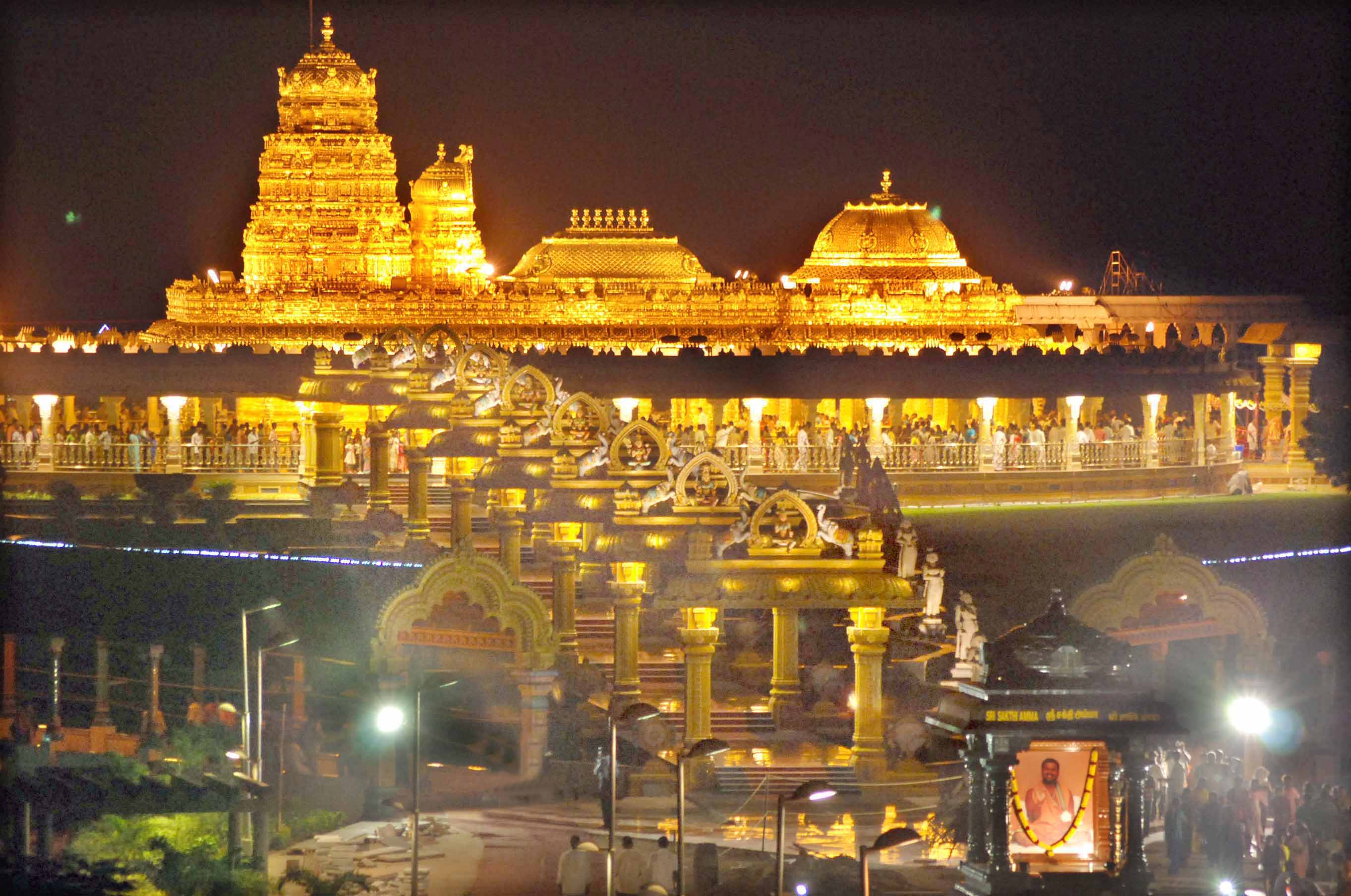 The golden temple complex inside the Sripuram spiritual park is situated at the foot of a small range of green hills at Thirumalaikodi (or simply Malaikodi) village, 8 km from Vellore in Tamil Nadu, India. It is 120 km from Tirupati, 145 km from Chennai, 160 km from Puducherry and 200 km from Bengaluru.The maha kumbhabhishekam or consecration of the temple and its chief deity, Sri Lakshmi Narayani, was held on 24 August 2007, and devotees from all religions and backgrounds are welcome to visit. This temple is gilded with 1500 kg of pure gold, double the 750 kg gilding of the Golden Temple at Amritsar. The salient feature of 'Sripuram' is the Lakshmi Narayani temple whose Vimanam and Ardha Mandapam is covered with pure gold, housing the deity Sri Lakshmi Narayani (female consort of Vishnu Narayana). The temple is located on 100 acres of land and has been constructed by the Vellore-based charitable trust, Sri Narayani Peedam, headed by its spiritual leader Sri Sakthi Amma also known as 'Narayani Amma'. The temple with its gold (1500 kg) covering, has intricate work done by artisans specialising in temple art using gold. Every single detail was manually created, including converting the gold bars into gold foils and then mounting the foils on copper. Gold foil from 9 layers to 10 layers has been mounted on the etched copper plates. Every single detail in the temple art has significance from the vedas. Sripuram's design features a star-shaped path (Sri chakra), positioned in the middle of the lush green landscape, with a length of over 1.8 km. As one walks along this 'starpath' to reach the temple in the middle, one can also read various spiritual messages -- such as the gift of the human birth itself, and the value of spirituality -- along the way. The Sri Narayani Hospital & Research Centre is a general hospital located near the Sripuram temple complex and is also run by the 'Sri Narayani Peedam' Charitable Trust.