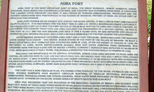 Agra Fort is a historical fort in the city of Agra in India. It was the main residence of the emperors of the Mughal Dynasty till 1638, when Mughal capital was shifted from Agra to Red Fort in Delhi. It is also a UNESCO World Heritage site and is about 2.5 km northwest of its more famous sister monument, the Taj Mahal. The fort can be more accurately described as a walled city. After the First Battle of Panipat in 1526, the victorious Babur stayed in the fort, in the palace of Ibrahim Lodi. He later built a baoli (step well) in it. The emperor Humayun was crowned in the fort in 1530. Humayun was defeated at Bilgram in 1540 by Sher Shah. The fort remained with the Suris till 1555, when Humayun recaptured it. Adil Shah Suri's general, Hemu, recaptured Agra in 1556 and pursued its fleeing governor to Delhi where he met the Mughals in the Battle of Tughlaqabad. Realising the importance of its central situation, Akbar made it his capital and arrived in Agra in 1558. His historian, Abu'l-Fazl, recorded that this was a brick fort known as 'Badalgarh'. It was in a ruined condition and Akbar had it rebuilt with red sandstone from Barauliu area in Rajasthan. Architects laid the foundation and it was built with bricks in the inner core with sandstone on external surfaces. Some 4,000 builders worked on it daily for eight years, completing it in 1573. It was only during the reign of Akbar's grandson, Shah Jahan, that the site took on its current state. Legend has it that Shah Jahan built the beautiful Taj Mahal in the memory of his wife, Mumtaz Mahal. Unlike his grandfather, Shah Jahan tended to have buildings made from white marble. He destroyed some of the earlier buildings inside the fort to make his own. At the end of his life, Shah Jahan was deposed and restrained by his son, Aurangzeb, in the fort. It is rumoured that Shah Jahan died in Muasamman Burj, a tower with a marble balcony with a view of the Taj Mahal. The fort was invaded and captured by the Maratha Empire in the early 18th century. Thereafter, it changed hands between the Marathas and their foes many times. After their catastrophic defeat at Third Battle of Panipat by Ahmad Shah Abdali in 1761, Marathas remained out of the region for the next decade. Finally Mahadji Shinde took the fort in 1785. It was lost by the Marathas to the British during the Second Anglo-Maratha War, in 1803. The fort was the site of a battle during the Indian rebellion of 1857, which caused the end of the British East India Company's rule in India, and led to a century of direct rule of India by Britain. The 380,000-square-metre (94-acre) fort has a semicircular plan, its chord lies parallel to the river and its walls are seventy feet high. Double ramparts have massive circular bastions at intervals, with battlements, embrasures, machicolations and string courses. Four gates were provided on its four sides, one Khizri gate opening on to the river. Two of the fort's gates are notable: the "Delhi Gate" and the "Lahore Gate." The Lahore Gate is also popularly also known as the "Amar Singh Gate," for Amar Singh Rathore. The monumental Delhi Gate, which faces the city on the western side of the fort, is considered the grandest of the four gates and a masterpiece of Akbar's time. It was built circa 1568 both to enhance security and as the king's formal gate, and includes features related to both. It is embellished with inlay work in white marble. A wooden drawbridge was used to cross the moat and reach the gate from the mainland; inside, an inner gateway called Hathi Pol ("Elephant Gate") – guarded by two life-sized stone elephants with their riders – added another layer of security. The drawbridge, slight ascent, and 90-degree turn between the outer and inner gates make the entrance impregnable. During a siege, attackers would employ elephants to crush a fort's gates. Without a level, straight run-up to gather speed, however, something prevented by this layout, elephants are ineffective. Because the Indian military (the Parachute Brigade in particular) is still using the northern portion of the Agra Fort, the Delhi Gate cannot be used by the public. Tourists enter via the Amar Singh Gate. The site is very important in terms of architectural history. Abul Fazal recorded that five hundred buildings in the beautiful designs of Bengal and Gujarat were built in the fort. Some of them were demolished by Shahjahan to make way for his white marble palaces. Most of the others were destroyed by the British between 1803 and 1862 for raising barracks. Hardly thirty Mughal buildings have survived on the south-eastern side, facing the river. Of these, the Delhi Gate and Akbar Gate and one palace – "Bengali Mahal" – are representative Akbari buildings. Akbar Darwazza (Akbar Gate) was renamed Amar Singh Gate by the British. The gate is similar in design to the Delhi Gate. Both are built of red sandstone. The Bengali Mahal is built of red sandstone and is now split into Akbari Mahal and Jahangiri mahal.