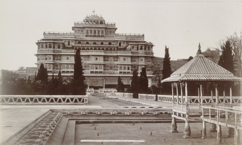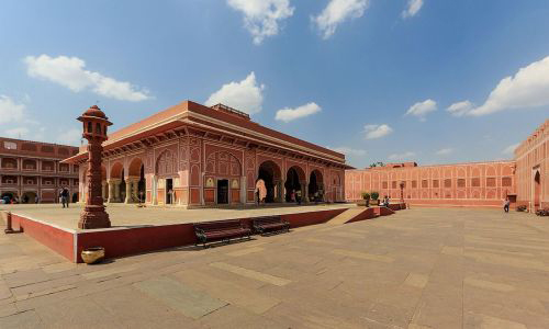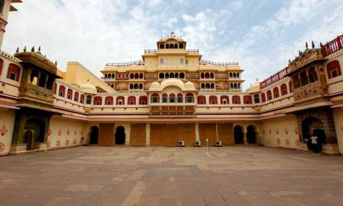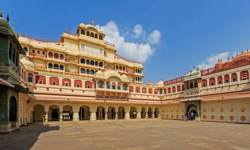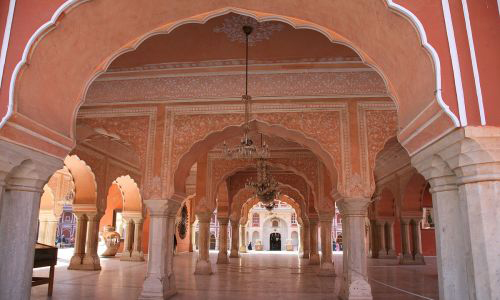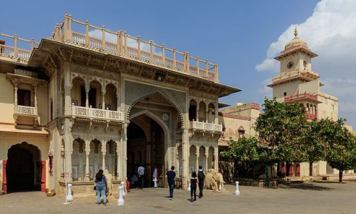 City Palace, Jaipur, which includes the Chandra Mahal and Mubarak Mahal palaces and other buildings, is a palace complex in Jaipur, the capital of the Rajasthan state, India. It was the seat of the Maharaja of Jaipur, the head of the Kachwaha Rajput clan. The Chandra Mahal palace now houses a museum but the greatest part of it is still a royal residence. The palace complex, located northeast of the centre of the grid-patterned Jaipur city, incorporates an impressive and vast array of courtyards, gardens and buildings. The palace was built between 1729 and 1732, initially by Sawai Jai Singh II, the ruler of Amber. He planned and built the outer walls, and later additions were made by successive rulers continuing up to the 20th century. The credit for the urban layout of the city and its structures is attributed to two architects namely, Vidyadhar Bhattacharya, the chief architect in the royal court and Sir Samuel Swinton Jacob, apart from the Sawai himself who was a keen architectural enthusiast. The architects achieved a fusion of the Shilpa Shastra of Indian architecture with Rajput, Mughal and European styles of architecture. The palace complex lies in the heart of Jaipur city, to the northeast of the very centre, located at 26.9255°N 75.8236°E. The site for the palace was located on the site of a royal hunting lodge on a plain land encircled by a rocky hill range, five miles south of Amber (city). The history of the city palace is closely linked with the history of Jaipur city and its rulers, starting with Maharaja Sawai Jai Singh II who ruled from 1699-1744. He is credited with initiating construction of the city complex by building the outer wall of the complex spreading over many acres. Initially, he ruled from his capital at Amber, which lies at a distance of 11 kilometres (6.8 mi) from Jaipur. He shifted his capital from Amber to Jaipur in 1727 because of an increase in population and increasing water shortage. He planned Jaipur city in six blocks separated by broad avenues, on the classical basis of principals of Vastushastra and other similar classical treatise under the architectural guidance of Vidyadar Bhattacharya, a Bengali architect from Naihati of present-day West Bengal who was initially an accounts-clerk in the Amber treasury and later promoted to the office of Chief Architect by the King. Following Jaisingh's death in 1957, there were internecine wars among the Rajput kings of the region but cordial relations were maintained with the British Raj. Maharaja Ram Singh sided with the British in the Sepoy Mutiny or Uprising of 1857 and established himself with the Imperial rulers. It is to his credit that the city of Jaipur including all of its monuments (including the City Palace) are stucco painted 'Pink' and since then the city has been called the "Pink City". The change in colour scheme was as an honour of hospitality extended to the Prince of Wales (who later became King Edward VII) on his visit. This colour scheme has since then become a trademark of the Jaipur city. Man Singh II, the adopted son of Maharaja Madho Singh II, was the last Maharaja of Jaipur to rule from the Chandra Mahal palace, in Jaipur. This palace, however, continued to be a residence of the royal family even after the Jaipur kingdom merged with the Indian Union in 1949 (after Indian independence in August 1947) along with other Rajput states of Jodhpur, Jaisalmer and Bikaner. Jaipur became the capital of the Indian state of Rajasthan and Man Singh II had the distinction of becoming the Rajapramukh (present day Governor of the state) for a time and later was the Ambassador of India to Spain. The City Palace is in the central-northeast part of the Jaipur city, which is laid in a grid pattern with wide avenues. It is a unique and arresting complex of several palaces, pavilions, gardens and temples. The most prominent and most visited structures in the complex are the Chandra Mahal, Mubarak Mahal, Mukut Mahal, Maharani's Palace, Shri Govind Dev Temple and the City Palace Museum. Entrance arch: Virendra Pol, Udai Pol near Jaleb chowk and the Tripolia Gate (triple gate) are the entry gates to the City Palace. The Tripolia gate is reserved for entry into the palace by the royal family. Common people and visitors can enter the place complex only through the Virendra Pol and the Udai Pol or the Atish Pol (Stable Gate). The entry from Virendra Pol leads to the Mubarak Mahal. The gateways are richly decorated. Mubarak Mahal, meaning the 'Auspicious Palace', was built with a fusion of the Islamic, Rajput and European architectural styles in the late 19th century by Maharaja Madho Singh II as reception centre. It is a museum; a fine repository of variety of textiles such as the royal formal costumes, sanganeri block prints, embroidered shawls, Kashmiri pashminas and silk saris as part of the Maharaja Sawai Man Singh II Museum. A noteworthy display here is of the set of voluminous clothes worn by Sawai Madhosingh I, who was 1.2 metres (3.9 ft) wide and weighed 250 kilograms (550 lb) but interestingly had 108 wives. Chandra Mahal or Chandra Niwas is the most commanding building in the City Palace complex, on its west end. It is a seven-storeyed building and each floor has been given a specific name such as the Sukh-Niwas, Ranga-Mandir, Pitam-Niwas, Chabi-Niwas, Shri-Niwas and Mukut-Mandir or Mukut Mahal. It contains many unique paintings, mirror work on walls and floral decorations. At present, most of this palace is the residence of the descendents of the former rulers of Jaipur. Only the ground floor is allowed for visitors where a museum is located that displays carpets, manuscripts and other items that belonged to the royal family. There is beautiful peacock gate at the entry to the Mahal. It has screened balconies and a pavilion at the roof from where a panoramic view of the city can been seen. It is set amidst well laid out gardens and a decorative lake in the foreground. "Sukh Nivas" or the "Hall of Res