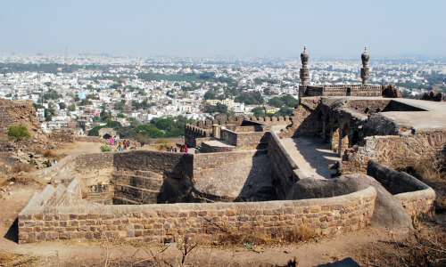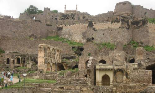 Golconda, also known as Golkonda or Golla konda ('shepherd's hill'), is a citadel and fort in Southern India and was the capital of the medieval sultanate of the Qutb Shahi dynasty (c.1518–1687), is situated 11 kilometres (6.8 mi) west of Hyderabad. It is also a tehsil of Hyderabad district, Telangana, India. The region is known for the mines that have produced some of the world's most famous gems, including the Koh-i-Noor, the Hope Diamond and the Nassak Diamond. Golconda Fort was first built by the Kakatiya dynasty as part of their western defenses along the lines of the Kondapalli Fort. The city and fortress are built on a granite hill that is 120 meters (480 ft) high and is surrounded by massive battlements. The fort was rebuilt and strengthened by Pratap Rudra of the Kakatiyas. The fort was further strengthened by the Musunuri Nayaks, who defeated the Tughlaqi army occupying Warangal. The fort was ceded by the Musunuri chief, Kapaya Nayak, to the Bahmani Sultanate as part of the treaty in 1364. The fort became the capital of a major province in the sultanate and, after its collapse, the capital of the Qutb Shahi dynasty. The fort finally fell into ruins after a siege and its fall to the Mughal Empire under Aurangzeb in 1687. After the collapse of the Bahmani Sultanate, Golkonda rose to prominence as the seat of the Qutb Shahi dynasty around 1507. Over a period of 62 years, the mud fort was expanded by the first three Qutb Shahi sultans into a massive fortification of granite, extending around 5 km in circumference. It remained the capital of the Qutb Shahi dynasty until 1590 when the capital was shifted to Hyderabad. The Qutb Shahis expanded the fort, whose 7 kilometres (4.3 mi) outer wall enclosed the city. The fort finally fell into ruin in 1687, after a year long siege leading to its fall at the hands of the Mughal emperor Aurangzeb.