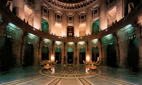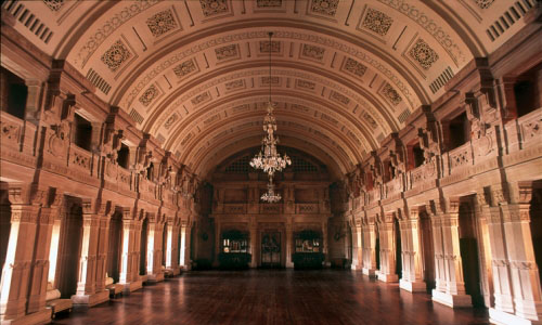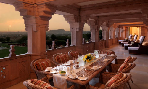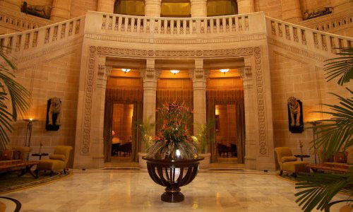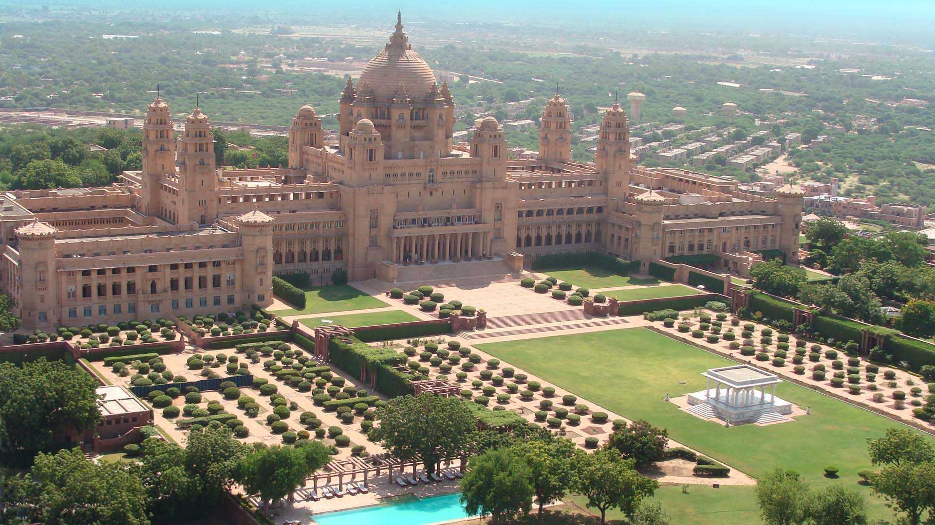 Umaid Bhawan Palace, located at Jodhpur in Rajasthan, India, is one of the world's largest private residences. A part of the palace is managed by Taj Hotels. Named after Maharaja Umaid Singh, grandfather of the present owner Gaj Singh of the palace, this edifice has 347 rooms and serves as the principal residence of the erstwhile Jodhpur royal family. A part of the palace also houses a museum. Umaid Bhawan Palace was called Chittar Palace during its construction due to use of stones drawn from the Chittar hill where it is located. Ground for the foundations of the building was broken on 18 November 1929 by Maharaja Umaid Singh and the construction work was completed in 1943. The Palace was built to provide employment to thousands of people during the time of famine. Recently, Umaid Bhawan Palace was awarded as the World's best hotel at the Traveller's Choice Award, which was organised by TripAdvisor. History of building the Umaid Bhawan Palace is linked to a curse by a saint who had said that a period of drought will follow the good rule of the Rathore Dynasty. Thus, after the end of about 50-year reign of Pratap Singh, Jodhpur faced a severe drought and famine conditions in the 1920s for a period of three consecutive years. The farmers of the area faced with famine conditions sought the help of the then king Umaid Singh, who was the 37th Rathore ruler of Marwar at Jhodpur, to provide them with some employment so that they could survive the famine conditions. The king, in order to help the farmers, decided to build a lavish palace. He commissioned Henry Vaughan Lanchester as the architect to prepare the plans for the palace; Lanchester was a contemporary of Sir Edwin Lutyens who planned the buildings of the New Delhi government complex. Lanchester patterned the Umaid Palace on the lines of the New Delhi building complex by adopting the theme of domes and columns. The palace was designed as an extraordinary blend of western technology, and many Indian architectural features. The palace was built at a slow pace as its initial objective was to provide employment to the famine-stricken farmers of the locale. The foundation stone was laid in 1929. About 2,000 to 3,000 people were employed to build it. However, the actual occupation of the palace by the Maharaja came only after its completion in 1943, very close to the period of Indian Independence. There was criticism in some quarters for embarking on an expensive project but it had served the main purpose of helping the citizens of Jodhpur to face the famine situation. The estimated cost of building the palace was Rs 11 million. When it opened its gilded doors in 1943 it was considered as one of the largest royal residences in the world. The site chosen for the palace was on a hill known as Chittar hill in the outer limits of Jodhpur, after which the palace is also known, where no water supply was available near by and hardly any vegetation grew as hill slopes were rocky. The building material required was not close by as sandstone quarries were at quite a distance. Since the Maharaja had the foresight to bring his project to fruition, he built a railway line to the quarry site to transport the building material. Donkeys were inducted to haul soil to the site. The sandstone transported by rail was dressed at site into large blocks with interlocking joints so that they could be laid without the use of mortar and thus create a wonderful edifice. The palace was built with "dun-colourd" (golden – yellow) sandstone with two wings. Makrana marble has also been used, and Burmese teak wood has been used for the interior wood work. When completed the palace had 347 rooms, several courtyards, and a large banquet hall which could accommodate 300 people. The architectural style is considered as representing the then in vogue Beaux Arts style, also known as Indo-Deco style. However, for many years the palace did not function fully on account of many tragic events in the royal family. Umaid Singh who stayed in the place for only four years died in 1947. Hanumant Singh who succeeded him also died at a young age; he had just won in the 1952 General Elections and was returning home after this win when his plane crashed and he died. Gaj Singh II who succeeded his father then decided in 1971 to convert a part of the palace in to a hotel. The Palace is divided into three functional parts – the residence of the royal family, a luxury Taj Palace Hotel, and a Museum focusing on the 20th century history of the Jodhpur Royal Family. The entire palace complex built with sandstone and marble is set in an area of 26 acres (11 ha) of land including 15 acres (6.1 ha) of well tended gardens. The palace, magnificent in its lavish proportions, consists of a throne chamber, an exclusive private meeting hall, a Durbar Hall to meet the public, a vaulted banquet hall, private dining halls, a ball room, a library, an indoor swimming pool and spa, a billiards room, four tennis courts, two unique marble squash courts, and long passages. The interior central dome sits above the sky blue inner dome. The inner vaulted dome is a major attraction in the palace which rises to a height of 103 feet (31 m) in the interior part which is capped by an outer dome of 43 feet (13 m) height. The entry to the palace has decorations of the Coat of arms of the Rathore Royal family. The entry leads to the lobby which has polished black granite flooring. The lounge area has pink sandstone and marble floors. Maharaja Gaj Singh, known as "bapji", stays in a part of the palace. The architecture of the palace is described as an amalgam of lndo-Saracenic, Classical Revival and Western Art Deco styles. It is also said the Maharaja and his architect Lanchester had considered the features of Buddhist and Hindu edifices such as the Temple Mountain-Palaces of Burma and Cambodia, and in particular the Angkor Wat in preparing the layout and design of the palace. The interior of the palace is in art deco desig