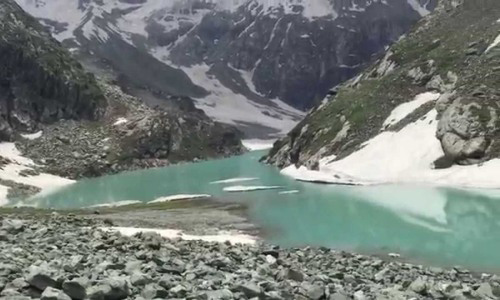 Tulian Lake a lake and tourist destination at Pahalgam in Anantnag District of the state of Jammu and Kashmir, India. It lies at an altitude of 3,684 metres (12,087 ft) above sea level, 16 kilometres (9.9 mi) southwest from Pahalgam and 11 kilometres (6.8 mi) from Baisaran. The lake often has chunks of ice floating in it. It is surrounded on three sides by mountains that rise to over 4,800 metres (15,700 ft) and that are usually covered with snow. It is located in a meadow dotted with pine forests. The lake lies between the two Himalayan mountain ranges of Pir Panjal and Zanskar.