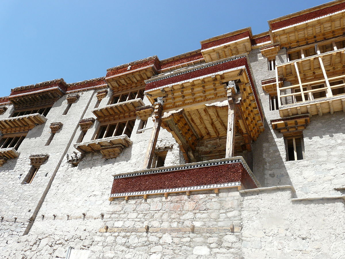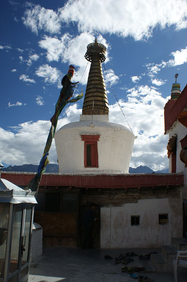 The Shey Monastery or Gompa and the Shey Palace complex are structures located on a hillock in Shey, 15 kilometres (9.3 mi) to the south of Leh in Ladakh, northern India on the Leh-Manali road. Shey was the summer capital of Ladakh in the past. The palace, mostly in ruins now, was built first in 1655, near Shey village, by the king of Ladakh, Deldan Namgyal, also known as Lhachen Palgyigon. It was used as a summer retreat by the kings of Ladakh. The Shey Monastery was also built in 1655 on the instructions of Deldon Namgyal, in the memory of his late father, Singay Namgyal, within the palace complex. The monastery is noted for its giant copper with gilded gold statue of a seated Shakyamuni Buddha. Shakyamuni Buddha is so named since Buddha was the sage (muni) of the Sakya people who resided in the Himalayan foothills and their capital was Kapilvastu. It is said to be the second largest such statue in Ladakh. Shey was the old capital of the upper Ladakh region. When the Dogras of Jammu invaded Ladakh in 1842, the Namgyals abandoned the palace and fled to Stok (they made it their permanent residence) on the opposite side of the Indus River. It is conjectured that the fort found in ruins, not dated, above the present palace at Shey, belonged to this period of invasion. Subsequently when the political dictates necessitated shifting of the capital to Leh, even then the importance of Shey continued since it was a mandatory requirement of the Namgyal kings to father their heir apparent here. Shey Monastery is located in the upper Indus Valley, just 15 kilometres (9.3 mi) east of the modern capital of Ladakh, Leh. Zanskar range of hills are on its southern side in the fertile Indus River valley. It has an average elevation of 11,204 feet (3,415 m). Shey is located on the road from Leh to Thikse Monastery. A large number of monasteries, stupas and rock carvings can be seen on this road. It can be approached by trekking 4 kilometres (2.5 mi) from Thiksey and the path is known as: "for having Ladakh’s biggest chorten fields with hundreds of whitewashed shrines of varying sizes scattered across the desert landscape." The nearest airport is at Leh. Special permission is essential to visit the monastery, as only one lama resides here and the inner sanctum is usually closed. On a lane, opposite to the Shey palace there is a hotel for visitors, which is surrounded by flowered gardens. The main Shakyamuni Buddha statue in the monastery is a 12 metres (39 ft) icon covering three floors of the monastery. The walls on both the sides of Buddha display the 16 Arhats (saints who achieved Nirvana), 8 on each side. The wall behind the statue has the images of the Buddha's two chief disciples, Sariputra and Maudgalyayana. Almost every wall around the Buddha statue is painted with one image or the other. The giant Buddha as seen in the monastery is on three levels; the lowest level shows his huge feet and “soles pointing upwards” and a mural of Shambunath, the middle floor shows murals of the Buddha in different postures and the upper floor is darkened by the soot of the butter lamps that burn eternally at the altar. The statue was first cast in parts, in Leh, at a place known as Zanstin. ‘Zans’ means “copper” and ‘til’ means “hammer”. The copper plates used in the statue were made from copper, collected from Lingshet mines and other villages of the Zanskar area. The plates from the copper ingots were made by hammering them on a nearby rock. It was first built in parts and then transported to the palace for installation. It is said that about 5 kilograms of gold was used for gilding the copper plates of the statue in the main monastery. On the upper floor of monastery, a number of beautiful wall paintings are displayed. The lower floor has a library with a large number of neatly preserved manuscripts and is decorated with murals of Buddha figures in various mudras (hand gestures). About 400 metres (1,300 ft) from the palace, there is another small shrine built by Sengge Namgyal. This shrine also houses another large statue of Shakyamuni Buddha in a sitting posture. Here also, the murals and images in side are similar to the palace shrine. It is recorded that this statue and the other one in the main monastery were crafted by a Nepalese sculptor named Sanga Zargar Wanduk. He was reportedly brought here by Sengge's mother, Gyal Khatun, not only to build this statue but also the main statue in the palace. Paldana Shering Gyaso, Gamani Jal Shring and Nakbiri were other craftsmen who assisted him. It is reported that in an isolated village called Chilling the descendants of these craftsmen live and are now known for their craftsmanship in conventional silverware. The small shrine also depicts murals, which represent the 16 Arhats, original disciples of the Buddha, together with some of the renowned teachers like Padmasambhava, Atisa and Tson-Ka-Pa. Near to this shrine, two small Tantric shrines also exist. Close to this shrine, carvings are seen on rock spurs on the road to the palace. These rock carvings are of the five Dhyani Buddhas; one of them is very large and close to the palace while the other four are located close to a chorten. Also seen are a large number of chortens to the east of the palace. At the edge of the valley, there is photong (official residence) of the Lama of the monastery from where there are scenic views of the Indus valley. The small palace is, however, dilapidated and is much smaller than the Leh palace. It is located below an abandoned fort. It has a golden chorten spire. But its importance is now more due to the Buddha deified in the monastery. Perched on top of the hill, the monastery commands panoramic view of the surroundings of Thikse, Stakna, Matho, Stok and also Leh. The offerings placed for worship in front of the deities in the sanctum are grain, jewels, holy signs and with mantars (holy chants inscribed inside it. A number of butter lit lamps are placed in th