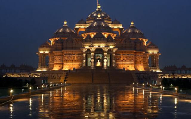Akshardham or Swaminarayan Akshardham complex is a Hindu mandir, and a spiritual-cultural campus in New Delhi, India. Also referred to as Akshardham Temple or Swaminarayan Akshardham, the complex displays millennia of traditional Hindu and Indian culture, spirituality, and architecture. The temple, which attracts approximately 70 percent of all tourists who visit Delhi, was officially opened on 6 November 2005 by Dr. A.P.J. Abdul Kalam. It sits near the banks of the Yamuna adjacent to the 2010 Commonwealth Games village in eastern New Delhi. The temple, at the centre of the complex, was built according to the Vastu shastra and Pancharatra shastra. The complex features an Abhisheka Mandap, Sahaj Anand water show, a thematic garden and three exhibitions namely Sahajanand Darshan (Hall of Values), Neelkanth Darshan (an IMAX film on the early life of Swaminarayan as the teenage yogi, Neelkanth), and Sanskruti Darshan (cultural boat ride). According to Swaminarayan Hinduism, the word Akshardham means the abode of God and believed by followers as a temporal home of God on earth. The main attraction of the Swaminarayan Akshardham complex is the Akshardham Mandir. It rises 141-foot (43 m) high, spans 316-foot (96 m) wide, and extends 356-foot (109 m) long. It is intricately carved with flora, fauna, dancers, musicians, and deities. Designed in accordance with the standards of Maharishi Vastu Architecture, it features a blend of architectural styles across India. It is entirely constructed from Rajasthani pink sandstone and Italian Carrara marble. Based on traditional Hindu architectural guidelines (Shilpa shastras) on maximum temple life span, it makes no use of ferrous metal. Thus, it has no support from steel or concrete. The mandir also consists of 234 ornately carved pillars, nine domes, and 20,000 murtis of sadhus, devotees, and acharyas. The mandir also features the Gajendra Pith at its base, a plinth paying tribute to the elephant for its importance in Hindu culture and India's history. It contains 148 life sized elephants in total weighing a total of 3000 tons. Under the temple's central dome lies the 11-foot (3.4m) high murti of Swaminarayan seated in abhayamudra to whom the temple is dedicated. Swaminarayan is surrounded by images of the faith's lineage of Gurus depicted either in a devotional posture or in a posture of service. Each murti is made of paanch dhaatu or five metals in accordance to Hindu tradition. The temple also houses the murtis of Sita Ram, Radha Krishna, Shiv Parvati, and Lakshmi Narayan.